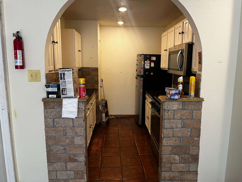 Before: This 3-bed, 2-bath ranch (1,450 sq ft, built in 1972) had its original galley kitchen, painted-over dark cabinets, faux marble counters, outdated appliances, and poor lighting. Buyers called the kitchen a “deal-breaker” and renters couldn’t connect.